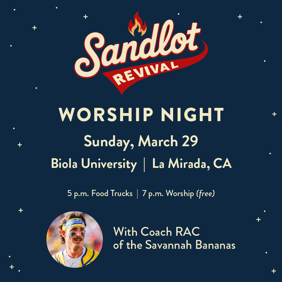 You're invited to Biola's campus a day earlier than Admitted Student Day to worship with us on Sunday, March 29 at Sandlot Revival - a city-to-city worship movement led by alumni Coach RAC, player of the Savannah Bananas. This event is centered on helping people find Jesus-focused places of worship, testimony and prayer in cities and communities where Banana Ball is played. Join your fellow admitted students at this special event the night before Admitted Student Day. RSVP here to let us know you're coming!